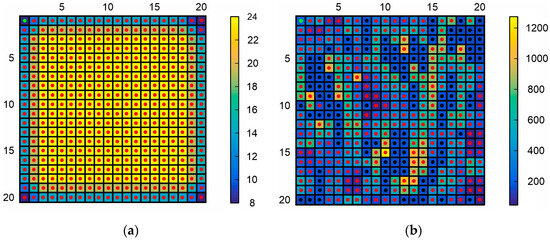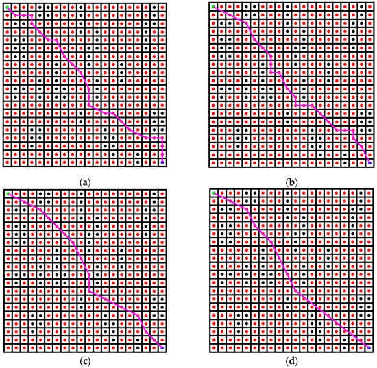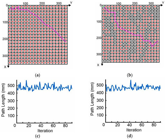 Figure 20a shows the optimal path formed by replacing random behavior with the proposed behavior, prey behavior, and following behavior. A 1.36% reduction in the length of the optimal path is observed with respect to the path’s length from the behaviors in