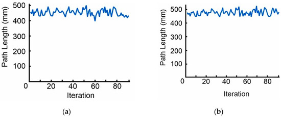 Figure 19b shows the path formed by replacing the random behavior with the proposed behavior. The length of the path with the proposed behavior is 2.63% shorter. It is also noticed that this change has led to a reduction in the optimal path’s oscillation, as well as a reduction in pointless wandering. The proposed methodology seems to explore more of the map due to the stronger variations observed in the path length diagram, but the reduction of unpredictable random behavior ultimately leads to a shorter final path.