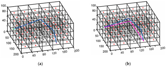 Figure 35c shows the environment of 3D path planning, and the initial 3D path is plotted in red color and the final path in magenta. The orange obstacle was not defined in the 3D environment and the initial formed path passed through it. The obstacle was not defined because its dimensions were different from the space represented by each discrete point and the phenomenon of obstacle over-expansion would occur.