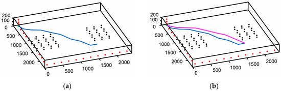 Figure 19a, the route obtained using the method with 24 possible points is plotted in blue, and the route obtained by applying the laser is plotted in magenta. In