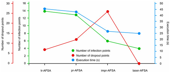 Figure 34 is the significant reduction in the execution time of the algorithm for the cases of tr-AFSA and pr-AFSA. While these algorithms are more computationally demanding, they need less time to locate the end point. This implies that the additional calculations resulting from the proposed methodologies are particularly effective for the navigation of the artificial fish. Especially for the integration of the laser, although there may be several failed attempts to activate it, it seems that they are not as time-consuming and the successful attempts can successfully cover the additional computational costs. The higher time required by tr-AFSA and pr-AFSA is attributed to the large number of possible movement points and the fish wandering through the environment until they reach the final point.