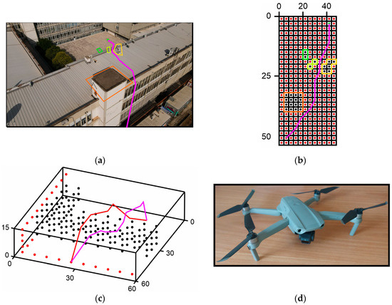 Figure 35a–d presents the process and results of applying the proposed methods for solving the 3D path planning problem for the drone’s case.