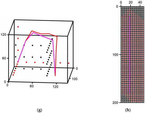 Figure 36g shows the modeled 3D environment, where the initial 3D path is plotted in red and the final path in magenta. The length of the initial 3D path is 289.7470 mm, while the length of the final path is 286.3273 mm.
