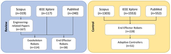The first is to examine a multitude of end-effector and exoskeleton robotic systems used for upper-limb rehabilitation in previous review papers. Thus, the keywords used were (Rehabilitation AND Robot AND Upper AND (Review OR Survey)). The second is focused on the control algorithms implemented in end-effector robots utilized for upper-limb rehabilitation. As a result, the keywords used were (Rehabilitation AND Robot AND Upper AND Control AND End AND Effector).