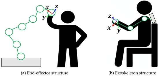 In this regard, several robotic systems have been built to serve as upper or lower extremity rehabilitation robots. These robots are mainly classified as end-effector robots or exoskeletons [8,9,10,11,12]. End-effector robots are said to have a simple structure that can be easily adapted to diverse patients’ configurations and health conditions. However, exoskeletons are considered to reproduce the kinematics of the human limb and support its motion through controlling each joint separately [8,10]. This makes exoskeletons more complex to develop but more precise in terms of joint control [13].