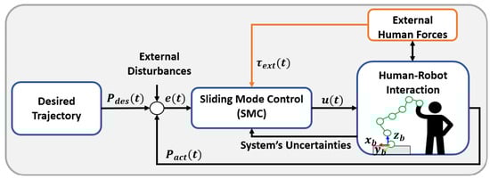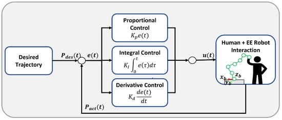 One of the most popular model-based controllers usually used for position control purposes is the Proportional–Integral–Derivative (PID) controller. PID control is a simple linear model-free control method used mainly during the passive training mode, by which the patient is completely passive and the robot has full control over the patient arm’s motion. PID control is used then for trajectory tracking purposes without considering the applied forces from and on the patient’s arm [92]. The PID block diagram is shown in Figure 3, and its control law is given by: