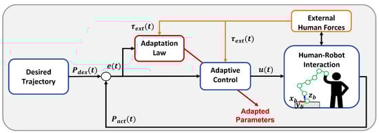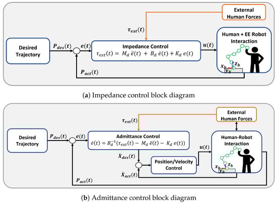 As the affected arm gains more strength, the human starts to apply a certain force on the robot which can be either assistive or resistive forces, activating the active training mode. These interactive forces ought to be regulated by the control approach through compliance or resistance. One of the main model-based controllers used to establish a dynamic relationship between the system’s motion and the human–robot interactive forces is impedance control [7,11,89,90]. This relationship is defined by a mass–spring–damper system represented by:
