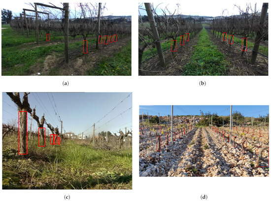 Vine trunk detection dataset sample. The images in (a–c) are samples from VineSet, and the image in (d) is a sample of data from the Korčula vineyard. Red rectangles indicate labeled vines.