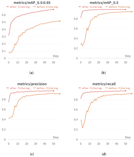 Validation training metrics for the YOLO model before and after dataset filtering. We can see that in (a) the mAP_0.5:0.95, which represents the mean average precision of the IOU metric over a 0.5–0.95 range for thresholds, our most important metric, was improved by about 17% after we filtered the dataset. (b) shows the mean average precision on the fixed threshold of 0.5. (c) shows precision or how often a model is correct then predicting the target class. (d) shows recall or what proportion of target classes was identified correctly.