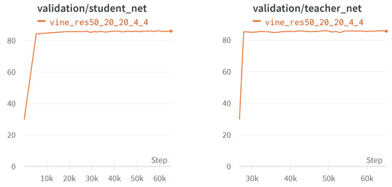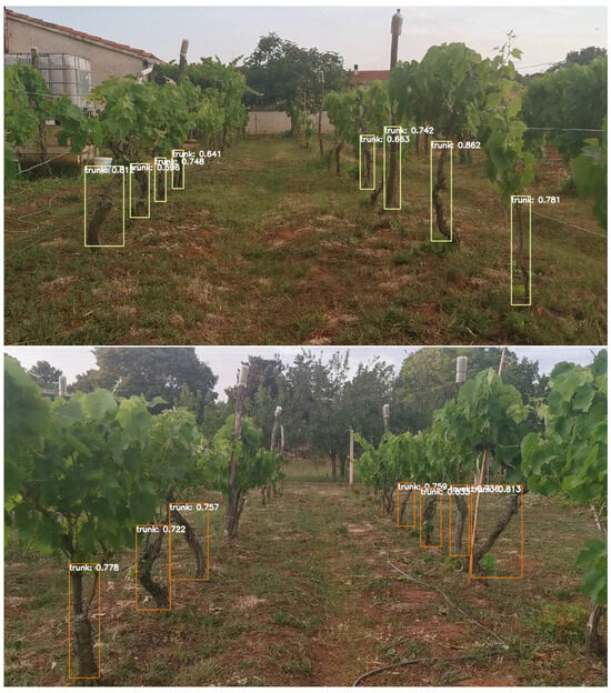 The graphs in Figure 3 show that the model reached an mAP_0.5:0.95 of about 68% on the validation set after 50 epochs. The mAP_0.5:0.95 represents the mean average accuracy over a range from 0.5 to 0.95 and is the most important metric for evaluating this model. It represents the average Intersect Over Union (IOU) at different threshold values in the range from 0.5 to 0.95 in steps of 0.05. In this context, the threshold value means the confidence level above which the network output is considered to be a detection. The IOU is an accuracy measure for the prediction of the model, which is calculated as the intersection between the prediction of the model and the ground-truth labeling divided by the union of the prediction and labeling. Figure 4 visually illustrates the calculation of this metric. Visual inspection of the Video S2 Supplementary shows that this model performs very well. Every nearby vine was recognized, and even distant vines were detected. In addition, the recognition was stable and consistent. Figure 5 shows some examples of vine trunk detection from vineyards in Istria that were not included in either the training set or in the validation set. A look at the graphs in Figure 3 before and after filtering the dataset confirms that our filtering approach had a significant positive impact on model performance.