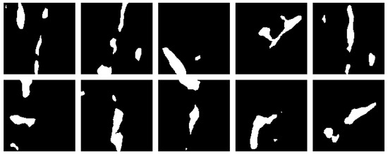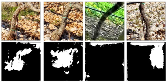 Example of SSL-ELN-generated annotations with 1200 white pixels or less. Some remnants of labeled vine trunks can be seen, but the images cannot be considered valid annotations due to noise and random white blobs in the images.