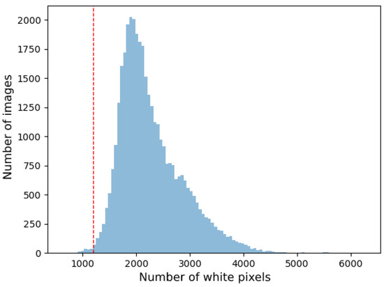 Histogram of the number of white pixels in the entire generated dataset with the threshold value marked in red below which the data were discarded. The threshold value of 1200 was chosen because a sudden increase in the number of white pixels could be seen in the histogram.