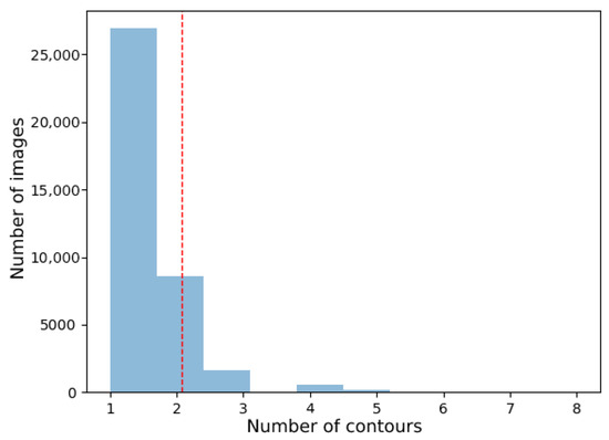Histogram of the number of contours in the generated dataset. It can be seen that most of the images had one or two contours. The red line represents a standard deviation from the mean and shows us that images with one or two contours made up the majority of the set.