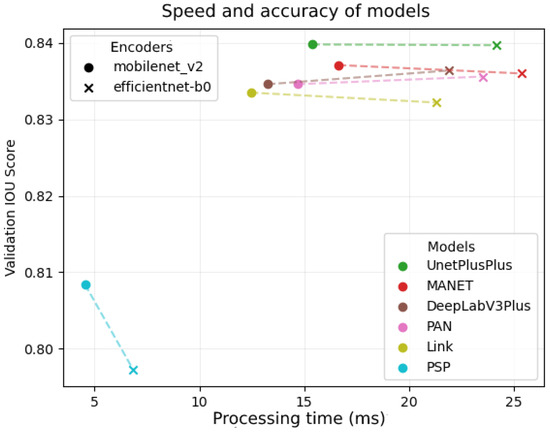 The data from Table 2 are displayed in a format that compares the speed of the model x-axis and its accuracy with validation data y-axis. The color represents the architecture of the model, while the shape of the dot represents the selected encoder. We can see that the efficientnet-b0 encoder significantly reduced the processing time in all models. We can also see that the PSP model was 2.7 times faster than all others, but only 3% worse.