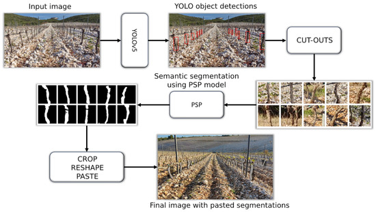 Diagram of the final procedure for segmenting vine trunks. The input image is preprocessed and sent through the YOLO network to recognize the vine trunks in the form of rectangles shown in red. The rectangles are then converted into squares, cut out from the original image, and resized to 128 × 128 pixels. The small cropped images are then sent through the PSP model, which provides binary masks of the vine trunks. These masks are then cropped so that they have the same shape as the original rectangle, resized to the same size, and inserted into the original image.