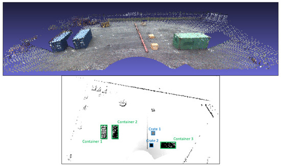 Colored 3D LiDAR measurements captured by the 3DWI system at a test site with three containers (top) and the constructed DEM (bottom) with the segmented containers (green) and wooden crates (blue).