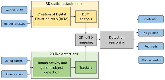 The live object detection module uses images from the stereo camera and overhead camera. To this footage, two detection models are applied: a generic object detector YOLOv5 [29] and an optimized human activity detector for both oblique and overhead view. The human activity detector is a custom YOLOv5 model specifically trained to have very high accuracy on critical classes such as persons and vehicles (detailed explanation in Section 4). On the other hand, the generic object detector is trained on the COCO dataset; hence, it can detect up to 80 different classes, but with a lower accuracy. Since not all COCO classes are relevant, we have condensed them into six categories: small, medium, and large objects; animals; vehicles; and persons. The benefit of the generic object detector lies in the diversity of classes. By combining the detections of both models, the 3DWI is able to detect a large range of classes with very high accuracy for persons and vehicles. Next, the 2D detections are converted to 3D detection using the one-to-one mapping of the calibrated sensor suite from the 2D camera to the 3D LiDAR data. 3D points that coincide with the 2D detection box are averaged and provide a good estimate of the 3D target location of both generic and human-specific objects. It may happen that a container is also detected by the generic object detector or that the generic detector detects objects in the no-go area or that a person is detected in a no-go (safe-zone) area. These cases are solved in the final reasoning step for both the oblique and overhead camera analysis. The flow of the detections based on the (static) 3D obstacle map and the live 2D/3D object detection is shown in Figure 5. The final set of 3D objects and red alerts (i.e., the human activity detection) are continuously sent to the CCU and 3D-Twin.