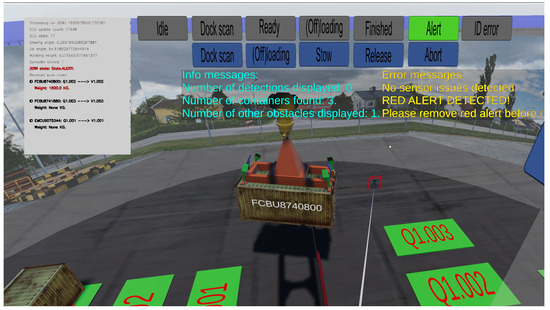 The 3D-Twin is the main interface between the operator and the autonomous crane. It renders the (pre-)captured remote environment, the live state of the crane, the recent dock scan, the detected objects (containers, no-gos, obstacles, red alerts), the current state of the autonomous crane operation, and basic controls. Collectively, this presents a detailed situational awareness for the operator tasked with overseeing the 3DWI and CCU systems. The 3D-Twin for the rooftop recordings is shown in Figure 2. A more complete 3D-Twin, shown in Figure 6, was created for the pilot tests with the RCHS. In this situation, the crane is slewing from the left to the right side when suddenly a person is detected (person with red bounding box to the right of the spreader), and the system comes to a halt. Several features improving the operator situational awareness can be observed in Figure 6. First, the 3D-Twin visualizes the states of the real crane in its lateral and vertical rotations, as well as those of the hoisting mechanism and the spreader. Second, all detected 3D objects by the 3DWI are rendered in real-time in the 3D-Twin, including containers and potential threats such as persons. Third, objects that are classified as human activity (i.e., persons and vehicles) are visualized with a 3D red bounding box to highlight their presence in the 3D-Twin to the operator. Subsequently, the system jumps to an alert state visible by the system state panels at the top in Figure 6. The operator is then asked to resolve the situation. Additionally, the operator can request and inspect the most recent oblique and overhead image from the 3DWI sensor suite to verify the presence of the threat. Fourth, on the left-hand side of the screen in Figure 6, the operator has access to the current crane work order list. In this manner, the operator can verify the crane’s operation. A work order, which is a container displacement from one container slot to another, is crossed off from the list (by the 3DWI) when the movement is completed. The weight of the live container is also displayed under the current work order for the operator to see. Fifth, the system receives from the CCU the container ID read as the container is about to be picked up. The 3D-Twin renders this container ID on the container sides, top, and bottom. Conversely, if the CCU detects a mismatch in the expected container ID, an error flag is raised, which will be communicated to the operator again through the 3D-Twin system state panels. The responsible operator can release an error when deemed safe using the blue buttons under the state panels in Figure 6.