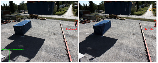 Table 3 shows the results of the speed test of the complete 3DWI system performing inference in three different configurations: the human activity detector on the oblique camera, the human activity with the generic object detector on the oblique camera, and the human activity with the generic object detector on both the oblique and jib-top camera. The speed test was performed in real-time with the sensor suite during the pilot demonstration. Since the objects are here again closer to the camera than in the training data, the human activity detector performs inference on images with a resolution of 640p, while the generic object detector uses a resolution 1280p.