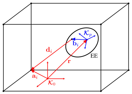The kinematic model of the IPAnema 3 Mini used for this work is taken from [4]. With reference to Figure 2, is a coordinate system fixed on the robot frame, and is a coordinate system on the end-effector. The pose of the platform in is defined through the position vector and the rotation matrix . For each cable, the position vector of the anchor point on the frame is in , whereas the position vector of the anchor point on the end-effector is in , for . For the robot at hand the cable mass is negligible, so that each cable can be modeled as a straight line segment in :