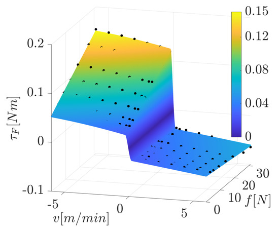 The function shape at the right-hand side of Equation (4) is chosen as the best fit for the registered data. The shape is the same for the positive and negative motion directions, but the coefficients found through a best-fitting procedure differ. Since our experiments provide data to estimate dynamic friction only starting from the minimum velocity (the tests conducted with smaller velocities showed little repeatability, and thus, were considered unreliable), it is necessary to model the friction torque for velocities in the interval . This was achieved by using a polynomial with degree four in v for every force value, i.e., the polynomial coefficients are functions of f, and they are recomputed for every input force value. In this way, the complete model of the friction torque is