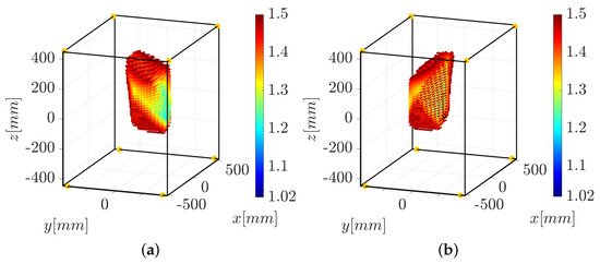 For the HC strategy adopted in this paper, the first step is to choose the pair of cables to be force-controlled for a given pose of the end-effector or a given trajectory. To achieve this, the force distribution sensitivity index introduced in [40] is computed for every possible pair of cables i and j of the IPAnema 3 Mini. We choose to force control the pairs of cables and because they guarantee N in large parts of the robot constant-orientation workspace, as shown in Figure 7 (in this paper, the end-effector orientation is always described by the rotation matrix , where is the identity matrix). Choosing a pair of force-controlled cables with a small (values of smaller than 2 N can be considered practically acceptable [41]) helps to minimize the errors in the achieved force distribution.