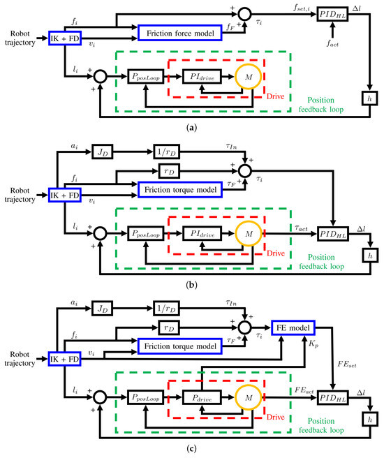 The scheme in Figure 8a (HC-f) is the simplest, and it represents the situation in which force sensors are used. In this case, is the force measured by the load cell mounted in the kinematic chain of cable i. The high-level PID controller compares with the desired one , which is computed by correcting the output force of the force distribution algorithm with the friction force estimated through the model in Equation (7). For the computation of , the theoretical values and are used because they yield non-noisy results. Once the cable length is corrected with , it is fed to the proportional controller for the position feedback loop () in the PLC, which computes a reference velocity to give as input to the PI controller () of the motor (M) drive. The position-controlled cables do not need the computation of , so in this case, is directly input into .