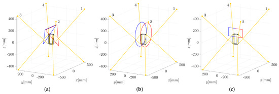 Accordingly, the tests are executed on dynamic trajectories (shown in Figure 9) assigned to the end-effector. One triangular and one circular motion law are defined in the workspace of the robot with N (Figure 7a), and the other two in the workspace of the robot where N (Figure 7b). The rectangular motion law is built so it passes through the plane , so that the pair of force-controlled cables must be changed during the execution of the movement. The paths where the force-controlled cables are wires 1 and 2 are plotted in red, whereas the paths in which the force-controlled cables are 3 and 4 are plotted in blue. All trajectories are purely translational motions, and they represent the movement of the center of the reference system . Though different platform velocities were tested, in all motion laws shown in this paper, for the sake of comparison, the end-effector reaches a velocity of 4 m/min after the first acceleration from a static position.