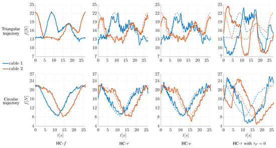 Examples of the evolution in time of the cable tensions in the force-controlled cables for the triangular (plots in the first row) and circular (plots in the second row) red trajectories in Figure 9. Different controllers are considered: controller HC-f, controller HC-, controller HC-e, controller HC- without the friction torque model. Solid lines represent measured forces, whereas dashed lines represent the theoretical forces computed through the force distribution algorithm.