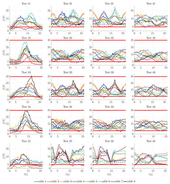 Evolution in time of the cable forces during the tests identified by the legend in Table 3. N and N are the desired bounds of cable tensions. Solid lines represent measured forces, whereas dashed lines represent the theoretical forces computed through the force distribution algorithm.
