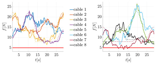Test 51 is the last in Table 4 that needs to be analyzed. Here, the triangular red trajectory of Figure 9a is executed, but the controller is different from the others previously described. The control scheme shown in Figure 8c is applied to all cables (i.e., all cables are force-controlled without using load cells). Better force tracking than with HC-e is achieved in all cables, as we can see in Figure 12. However, applying force control in all cables results in poor manipulator accuracy, with a maximum position error of mm, as shown in Table 4.