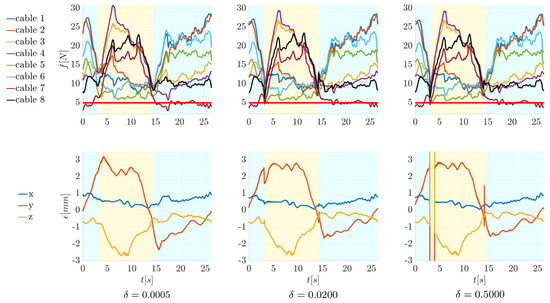 Some tests were conducted to analyze the effect of changing the pair of force-controlled cables during the execution of a trajectory. For this purpose, the rectangular motion law in Figure 9c is considered. The change in the force-controlled cables is managed as described in Section 3 through the value of the scaling factor h in Equation (10). While cables 5, 6, 7, and 8 are always position-controlled, the scheme shown in Figure 8c is applied to all the first four cables. When the pair of force-controlled cables is switched, the value of h goes from zero to one in the cables on which the force control is activated and vice versa in the cables on which the force control is deactivated. In Figure 13, the effect of increasing is analyzed on the evolution in time of the forces and the position error. The areas in light blue represent the parts of the trajectory in which the force-controlled cables are 1 and 2, while the areas in yellow are the ones in which the force-controlled cables are 3 and 4. The controller used for these tests is always HC-e.