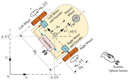 The measurable variables of the mobile robot are grouped into two classes. The variables of the first class are motion variables, namely the angular velocities and accelerations of the active wheels, being measured onboard and using optical encoders, see [,]. The variables of the second class are motion variables, namely the heading angle and heading angle rate (the time derivative of the heading angle) of the mobile robot. The heading angle of the vehicle, as well as its derivative, are measured externally by remote optical sensing systems, indicatively see [,]. Here, the controller is implemented onboard the robot. Thus, the measurement signal of the optical sensing system is wirelessly transmitted to the controller. Clearly, the transmission of these measurements through the network introduces a time varying delay on the transmitted signal. Hence, the measurable output vector is determined as follows: