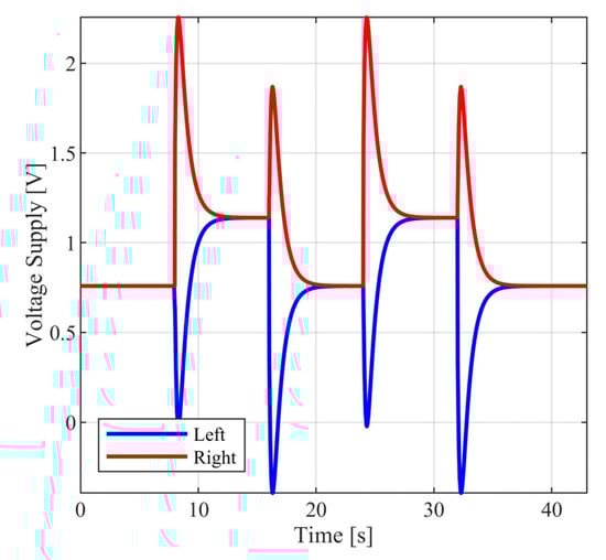 Here, the dynamics of the differential drive mobile robot depicted in Figure 1 are studied, under pure rolling and no lateral slip conditions. The active wheels of the mobile robot are driven by appropriate DC motors, indicatively see [,,,,]. As already mentioned, the dynamics of the vehicle will be extended to include unknown external disturbances and unknown actuator faults. Clearly, since the mobile robot is constrained to ensure pure rolling and no lateral slip conditions, external forces and moments can equivalently be represented as additive torques applied to the active wheels of the robot. Similarly, the actuator faults are represented as unknown additive voltages of the driving motors. According to [] and considering the above additive disturbances and faults, the nonlinear dynamic model describing the motion of the mobile robot is expressed in a nonlinear state space form as follows: