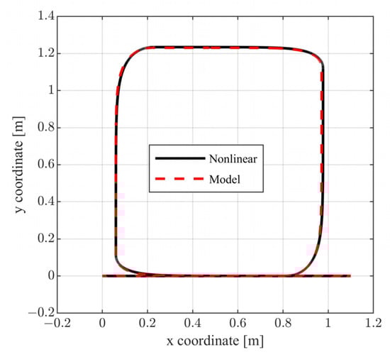 Of particular interest is the use of inverse dynamics/feedback linearization type of controllers for the motion control (indicatively see [,,,,,,]) of robotic vehicles, aerial robots, and robotic manipulators. In [], a proportional-derivative (PD) feedback linearization controller, designed for optimal trajectory tracking in nonholonomic wheeled mobile robots, is introduced. The proposed approach uses a population-based optimization algorithm, which is utilized to refine the PD controller. In [], the problem of controlling six-joint robot manipulators handling various loads through a nonlinear control approach is investigated. The proposed method incorporates nonlinear static feedback alongside a nonlinear proportional and derivative precompensator, aiming to resolve the position control problem across all models/different loads using a single controller. The controller is designed to meet the criteria of common input/output decoupling, while also ensuring the following of common arbitrary commands. The work in [] focuses on the trajectory control of nonholonomic robotic systems in the presence of model uncertainties. It introduces a tracking controller that merges inverse dynamics control with an adaptive robust PID control approach, providing resilience against both parametric and nonparametric uncertainties. In [], the motion control of an automated guided vehicle (AGV) is achieved using a blend of PID control and a controller based on inverse actuator dynamics. This inverse dynamics controller compensates the unmodeled nonlinearities in the system, achieving a precise rotor speed control in the DC motor. This is essential for the robot’s accurate following of the planned trajectory. In [], a control technique for differential drive wheeled mobile robots with nonholonomic constraints, which utilizes a backstepping-like feedback linearization approach, is introduced. The proposed method employs cascaded kinematic and dynamic linearization, resulting in a more straightforward and modular control framework. Initially, pseudo commands for the robot’s linear forward velocity and heading angle are crafted based on kinematics. Subsequently, actual torque inputs are formulated to ensure these real movements align with the pseudo commands. In [], the problem of trajectory tracking control in differential drive robots with input limitations is investigated. In particular, a robust, set-based receding horizon tracking method that effectively manages state-dependent input constraints is proposed. In [], the authors propose a strategy for avoiding collisions, specifically designed for differential drive robots operating under constraints in environments with static but unknown obstacles. To achieve this, they use the nonlinear kinematics of the robot towards developing a feedback linearization controller. Additionally, they develop a receding horizon control approach that is specially adapted to handle constraints on states and inputs that vary over time.