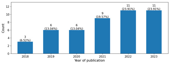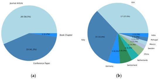 As shown in Figure 3, the selected papers were published between 2018 and 2023. The majority were published in the last three years (n = 31, 67.4%). Most papers are peer-reviewed journal articles (n = 26), 19 are conference papers, and only 1 is a book chapter (Figure 4). Most of the papers were conducted in the USA (n = 17, 37.0%) and Italy (n = 15, 32.6%). The rest were conducted in Germany (n = 3), Switzerland (n = 3), Netherlands (n = 2), China (n = 2), Sweden (n = 1), Mexico (n = 1), Portugal (n = 1), and India (n = 1) (Figure 4).