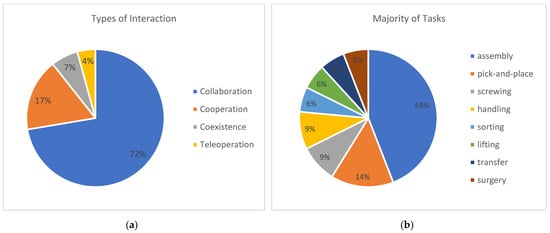 Figure 5 shows that the studies reviewed primarily focused on assembly tasks [38,39,48,53,54,57,58,61,63,64,72,73,76,77,80] with other frequent activities including pick-and-place [44,55,60,65,79], screwing [41,70,71], handling [38,41], sorting [51,79], lifting [41,49], transferring [36,70], and surgical procedures [47,69]. These tasks represent the core applications of collaborative robots in current research. Additionally, a range of specialized tasks such as surface polishing [38], welding [38], guiding [66], inspecting [70], weighing [70], and search-and-rescue [46] were explored. Innovative applications extended to collect-and-delivery [52], space exploration, wheelchair control, autonomous driving [47], matching [75], testing, and tracking moving objects, showcasing the diverse potential of cobots across various industries.