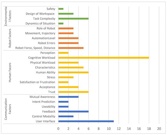 Within the selected studies, 24 factors that influence human decision making during tasks were identified. Generally, these factors affecting human decision making are categorized into four groups: human factors, robot factors, communication factors, and environmental factors. (Figure 6, Table 5).