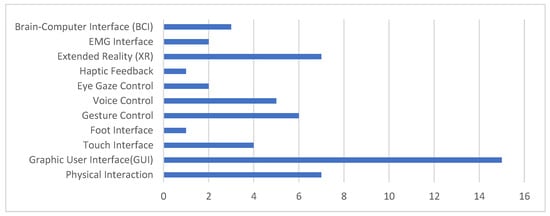 Among all the studies, the conventional Graphical User Interface (GUI) was the most used, featuring in 15 studies. Emerging interfaces, such as XR-based interfaces, were present in 7 studies, as were physical interfaces. Gesture recognition was included in 6 studies, voice control in 5, touch interfaces in 4, Brain–Computer Interfaces (BCIs) in 3, and eye gaze tracking in 2. Additionally, EMG-based interfaces were explored in 2 studies, while foot interfaces and haptic feedback were each the subject of 1 study. Several studies mentioned multi-model interfaces.