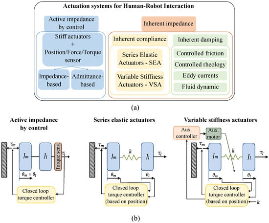 In the last two decades, several exoskeleton prototypes have been proposed using different implementation principles depending on the field of application [], such as neuro-rehabilitation and assistance [,,,], human power augmentation [] and telepresence [,,]. The majority of exoskeletons employed in the aforementioned fields—especially for rehabilitation purposes—are active, which means they employ an actuation system capable of actively providing and transmitting the required force to the human user. There are many types of actuator systems, each one employing different solutions for power transmission, such as geared actuators [,], tendon drives [,], hybrid solutions [,] and pneumatic or hydraulic systems [,,]. According to how each actuation system adjusts the impedance displayed to the user, it is possible to classify the actuators employed in pHRI into two main categories, as shown in Figure 1a. There are actuation systems with active impedance by control— i.e., they render impedance by the means of a control system—which mainly rely on position and torque sensors, and others that present inherent impedance—i.e., the impedance is obtained by inherent mechanical properties of the actuator—such as compliance or damping [].