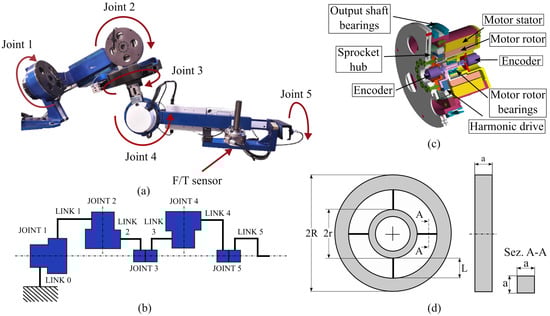 (a) The Rehab-Exos, a 5 DOF upper limb exoskeleton with four actuated joints. The joints , and share the same characteristics: high reduction ratio (100:1) obtained by harmonic drive, an embedded torque sensor and maximum actuation torque of 150 Nm. The joint is composed of a semi-circular guide actuated by a DC motor through tendon transmission. Joint is passive. The exoskeleton is equipped with a force/torque sensor at the end effector that is used for evaluation purposes. (b) Joint and link schematic view of the Rehab-Exos exoskeleton. (c) The section view of the actuators of , and . (d) Two-dimensional dimensions of the torque sensor.
