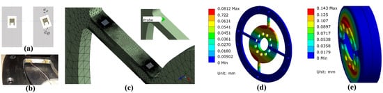 (a) A possible cause of the high sensitivity to non-axial load is the strain gauge mounting misalignment. The value represents the linear displacement, while the angular one is represented by the value . (b) A detail of the mounted strain gauges on the torque sensor. (c) Regarding the FEM analysis, a more dense grid mesh for the zone of interest is used. For each area, the average strain along the radial direction is computed. (d) Results of the FEM analysis on the torque sensor and on the flexible spline deformation under non-axial load (e).