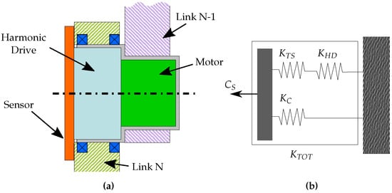 (a) Schematic view of the joint. The torque sensor connects in series the motor and the link n; nevertheless, it is not structural and is designed to transmit only axial torque. (b) The kinematic chain of the joint to non-axial loads. and represent the stiffness of the torque sensor and of the harmonic drive to non-axial load, respectively, whereas is the bearing stiffness.