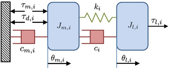 Each joint is modeled with a two-mass system with a spring and damper (Figure 6) due to the elasticity of the harmonic drive speed reducer and torque sensor for joints , and and due to the cable transmission for joint . The selected single-joint model is as follows.