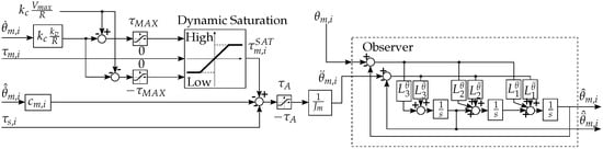 Block scheme of the acceleration estimator basing on torque measurements. The left side of the scheme models the motor dynamics, and it takes into account saturation effects. The right side of the scheme shows the implementation of the observer.