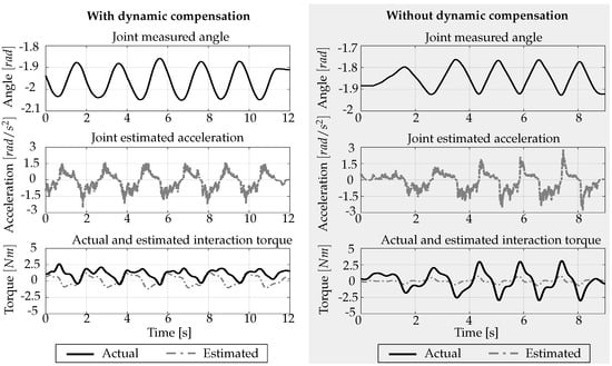The high transparency—the average force modulus at the end effector is less than 6 N for JTFC1—is also due to the effect of the dynamic compensations. A correct estimation of the joint acceleration is crucial for obtaining a transparency enhancement. This is the reason why the dynamic contributions are weighted by a constant . Indeed, a high transparency exhibiting a stable behavior can only be obtained with a very accurate acceleration estimation. The proposed estimation methodology using the torque sensor and motor data can help to further improve the estimation process.