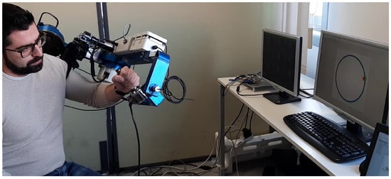 As depicted in Figure 2, the exoskeleton has a serial architecture which is isomorphic with human kinematics. It comprises a shoulder joint which is fixed in the space, and it is composed of three active joints, , and , an active elbow joint, , and a passive revolute joint, , allowing wrist prono/supination. For a more detailed description of both the Rehab-Exos and actuation groups, the reader can refer to Ref. [40]. The exoskeleton is grounded to a supporting structure that can be easily moved via passive wheels, and the height of the first link can be adjusted; thus, the position of the center of the shoulder of the exoskeleton can be set to fit the center of the shoulder of the user. The actuation stage of the joints , and of the exoskeleton is identical. These joints integrate a compact harmonic drive (HD) component set—which implements a high reduction ratio of 100:1—and a custom-made frame-less, brushless torque motor. The maximum joint output torque of the actuator is equal to 150 Nm with an overall weight of 3.7 kg and a motor shaft inertia, reduced to the joint output shaft , equal to 2.5 kgm2. The adopted mechanical components limit both the back-drivability—when the motor is powered off—and the overall mechanical complexity. Nevertheless, the user never holds the weight of the joints because the gravitational and dynamic contributions are modeled and provided by the torque controller. Then, the reaction torques/forces to the first link are exerted by the supporting structure.
