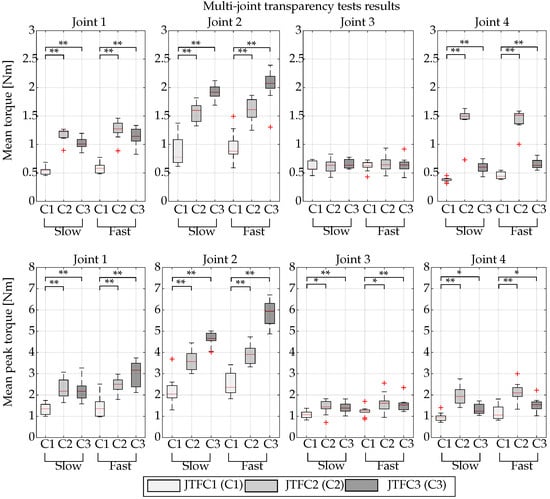 - Transparency: It relates to the ability of the robotic system to not apply any resistance to free motion when interacting with a human user who is moving voluntarily [], or, equivalently, it means that the robot’s reaction forces perceived by the user are minimal []. Although no standard procedures exist for measuring transparency in pHRI, there is a general consensus in the exoskeletons field to refer not only to end effector resistance forces but also to single-joint resistance torques or measurements coming from specific contact points [];