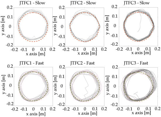Although the basic-state feedback control (JTFC2) presents an average force modulus at the end effector which is similar to that of the passivity-based feedback control (JTFC3), it hinders the user’s voluntary motion with a major impact with respect to the other controllers. Indeed, the end effector trajectory due to the controller JTFC2 is the farthest from the desired one. This is because JTFC1 and JTFC3 take into account (although in different ways) both the link and motor inertia, whereas the JTFC2 control considers only the motor inertia.