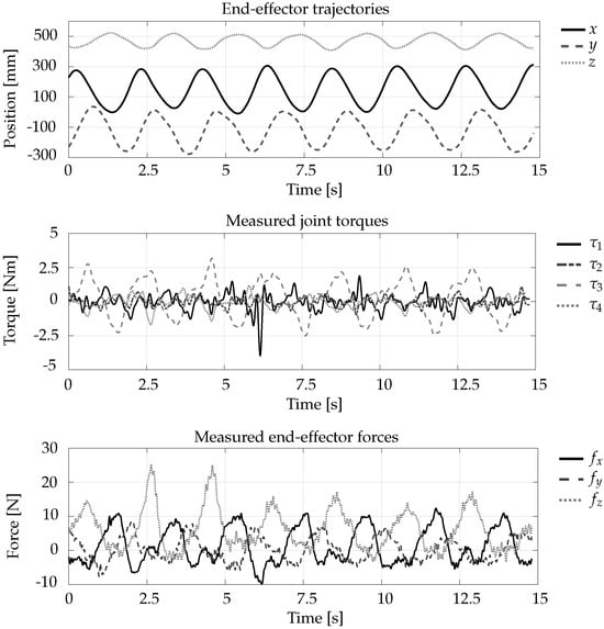The implemented torque controllers can also be used to render the interaction forces exchanged with a virtual surface equipped with a given stiffness and damping, thus acting as impedance controllers. In these tests, the contact forces at the end effector are proportional to the length of the end effector penetration into the virtual wall surface and to its speed. Forces are then converted to desired joint torques by multiplying Equation (39) by the transpose of the Jacobian, where the control commands (30), (35) and (37) are used for JFTC1, JFTC2 and JFTC3, respectively.